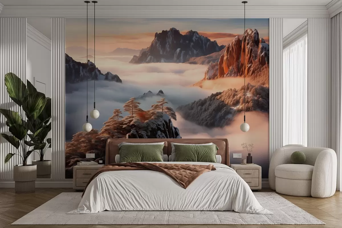 Murais de parede Encantadora paisagem de montanha com nevoeiro e árvores Nr. w08807