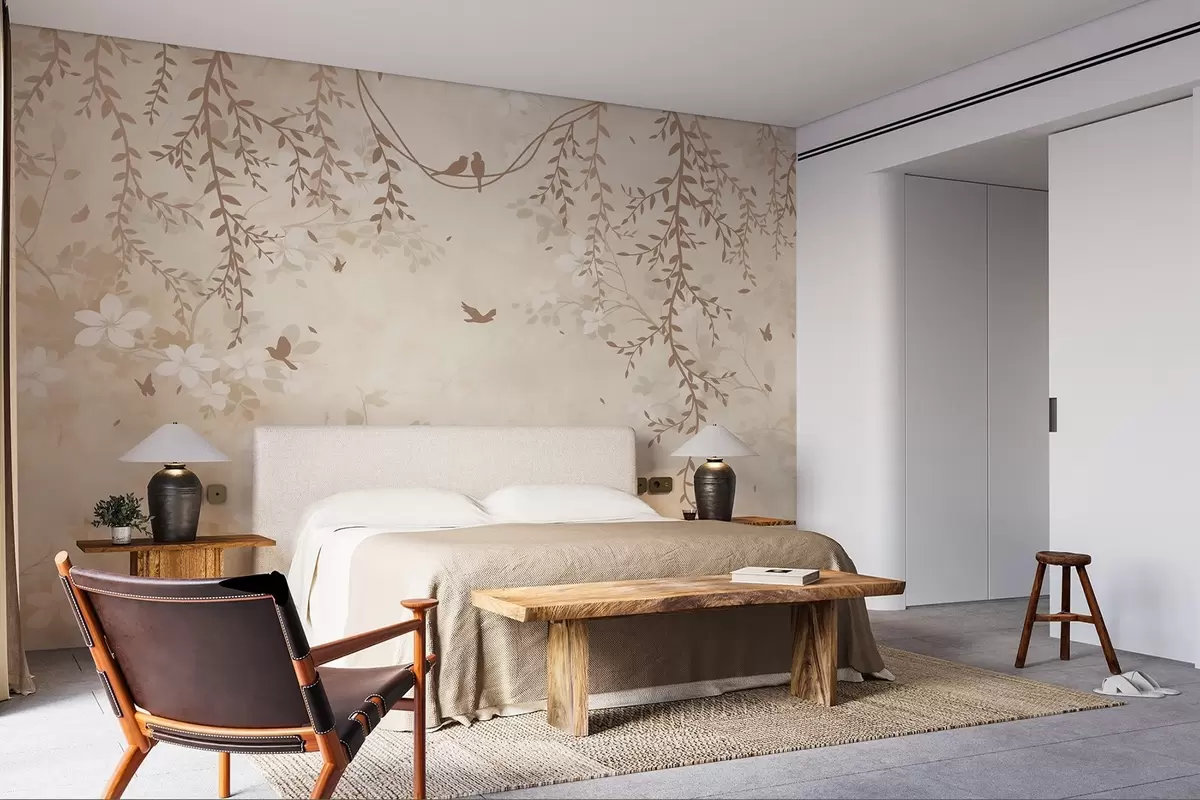 Murais de parede Pássaros com plantas suspensas e um padrão floral em tons de bege-creme claro Nr. w08809