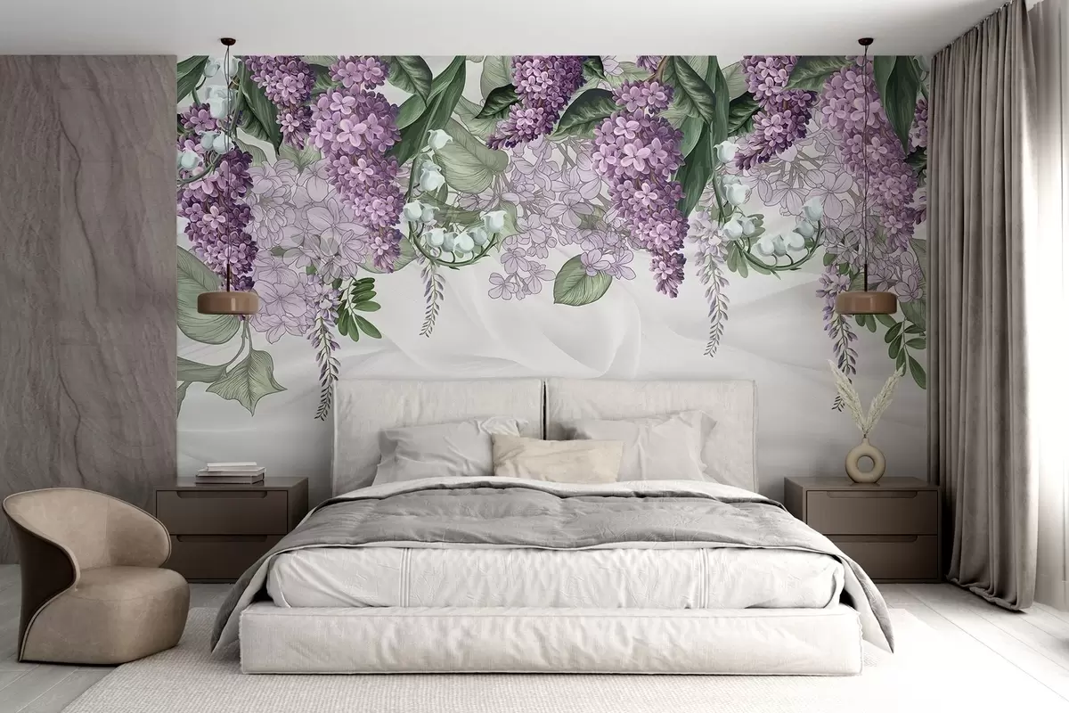 Murais de parede Flores lilás pastel e folhas verdes sobre um fundo branco com textura de imitação de seda Nr. w08825