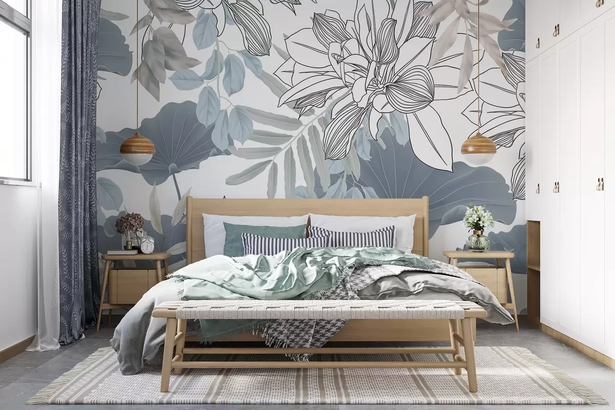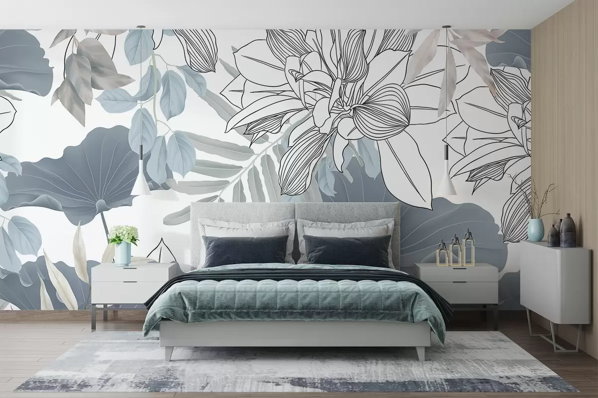 Murais de parede Estampado floral com flores de lótus e folhas em azul e branco sobre um fundo branco Nr. w08827