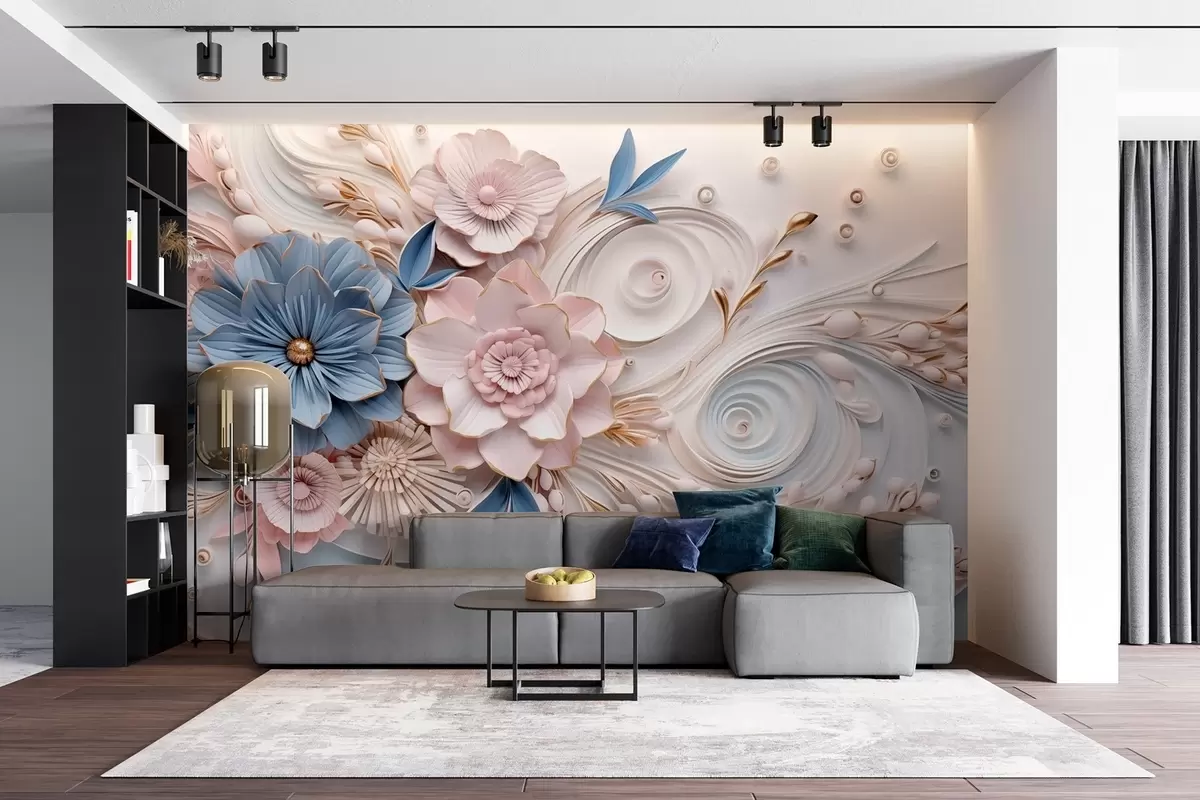 Murais de parede Uma composição floral delicada em tons de rosa e azul com um fundo em relevo suave Nr. w08847