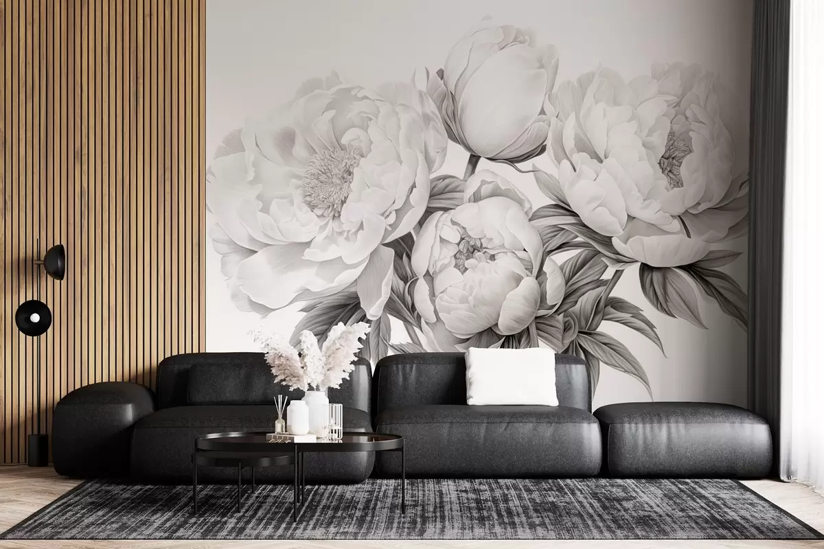 Murais de parede Peónias a preto e branco num estilo de desenho a lápis Nr. w08852