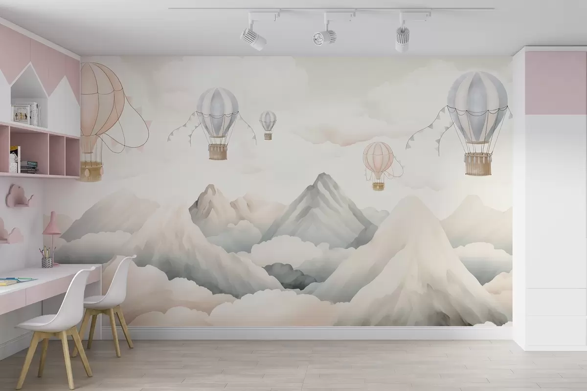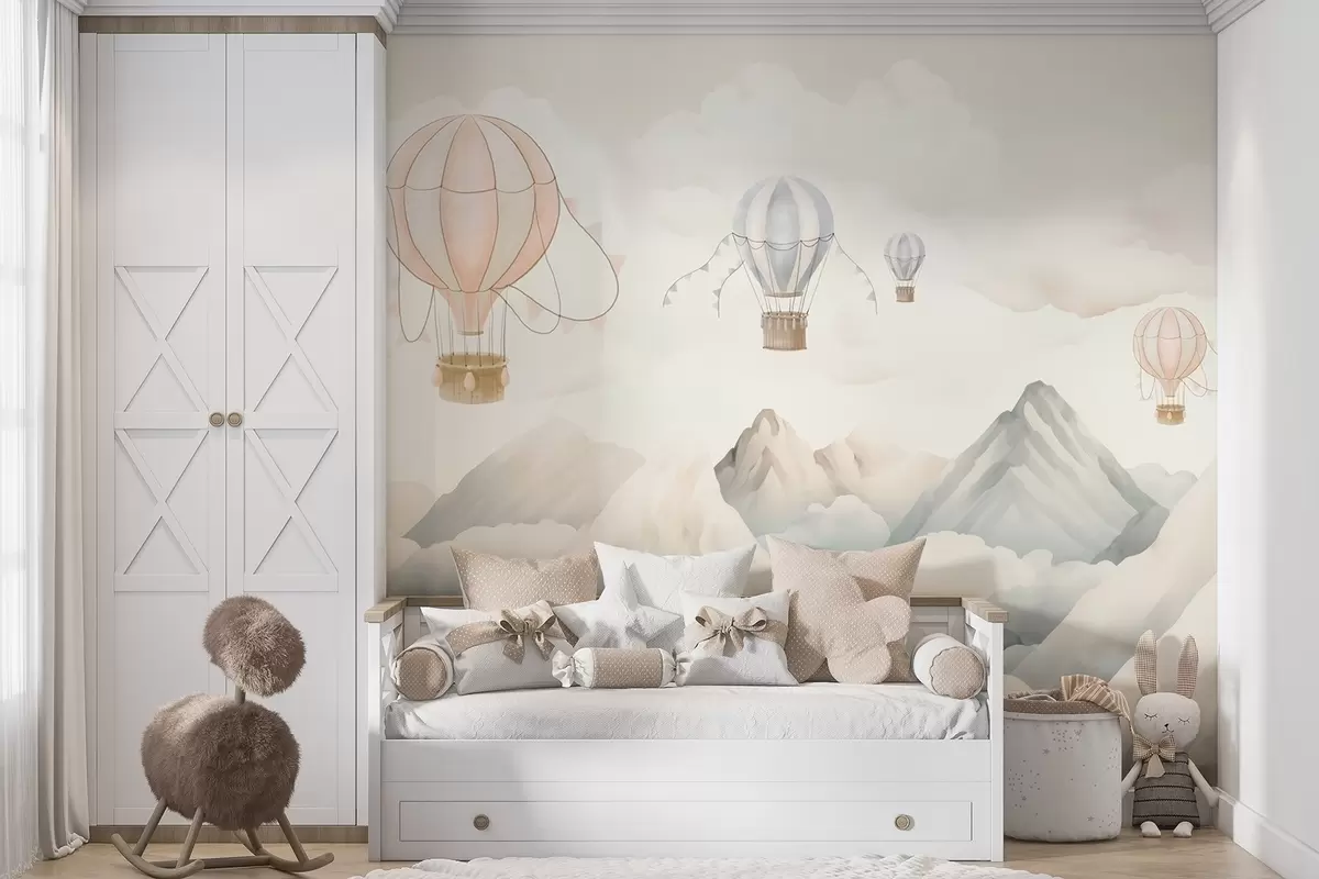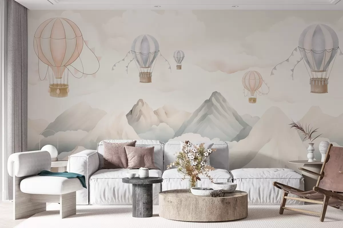 Murais de parede Balões de ar quente a flutuar sobre montanhas em tons pastel neutros e suaves Nr. w08853