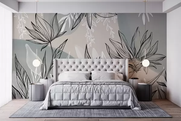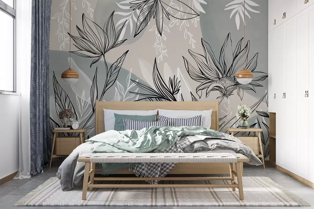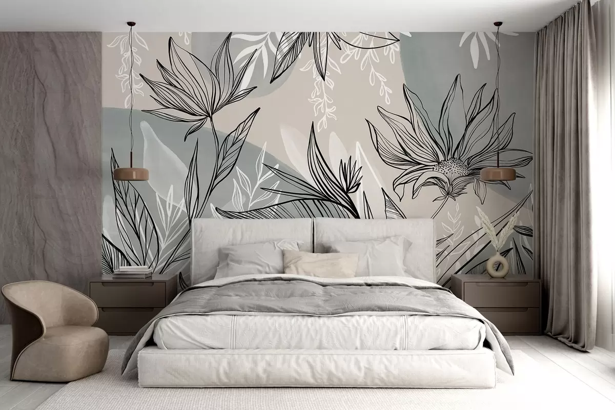 Murais de parede Arte de linhas florais com grandes folhas e flores, sobre um fundo de aguarela bege e azul Nr. w08865