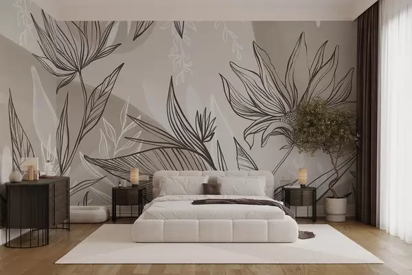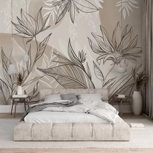 Murais de parede Arte de linhas florais com grandes folhas e flores, sobre um fundo de aguarela bege Nr. w08865v1