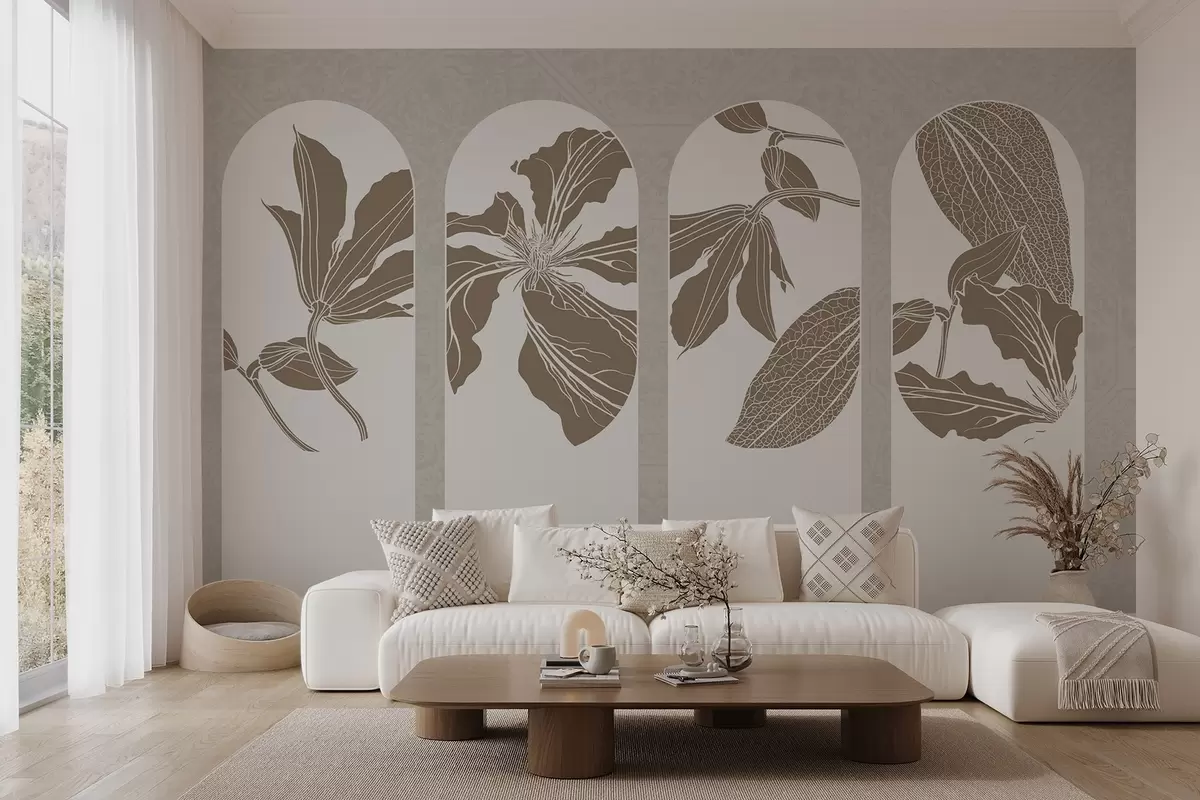 Murais de parede Arcos elegantes com desenhos florais em bege e branco, sobre um fundo bege texturado, estilo minimalista Nr. w08866
