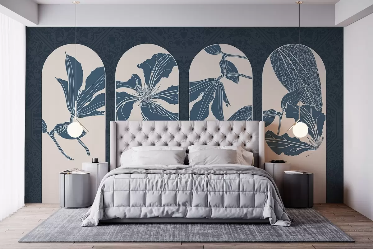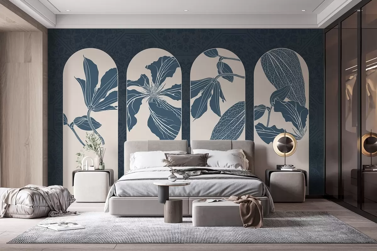 Murais de parede Arcos elegantes com desenhos florais em azul escuro e branco, sobre um fundo bege texturado, estilo minimalista Nr. w08866v1