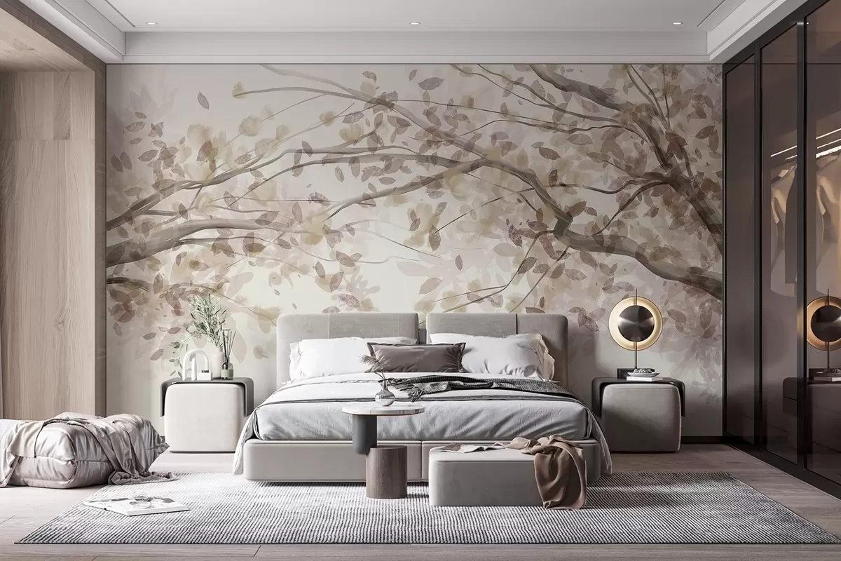 Murais de parede Ramos de flores com folhas bege, cores suaves, pormenores delicados, estilo aguarela, sobre um fundo claro Nr. w08867v1