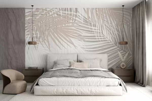 Murais de parede Folhas de palmeira em tons de bege claro e branco, folhagem tropical, cores pastel suaves, design minimalista Nr. w08869