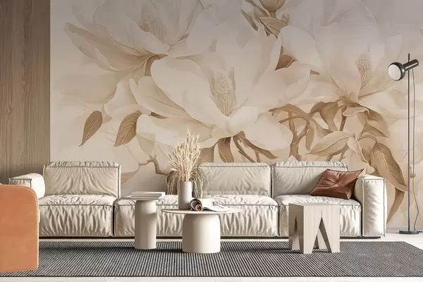 Murais de parede Flores de magnólia com pétalas brancas e bege, folhas e ramos castanhos, estilo aguarela suave e delicado Nr. w08886