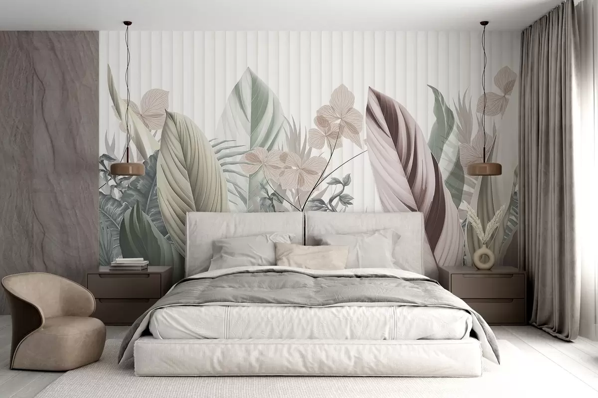 Murais de parede Folhas tropicais com cores pastel suaves, verde claro, rosa claro e castanho claro, linhas verticais no fundo Nr. w08892
