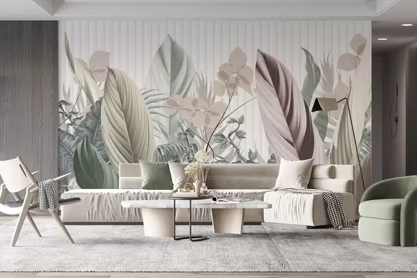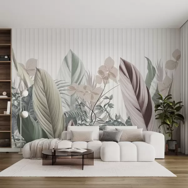 Murais de parede Folhas tropicais com cores pastel suaves, verde claro, rosa claro e castanho claro, linhas verticais no fundo Nr. w08892