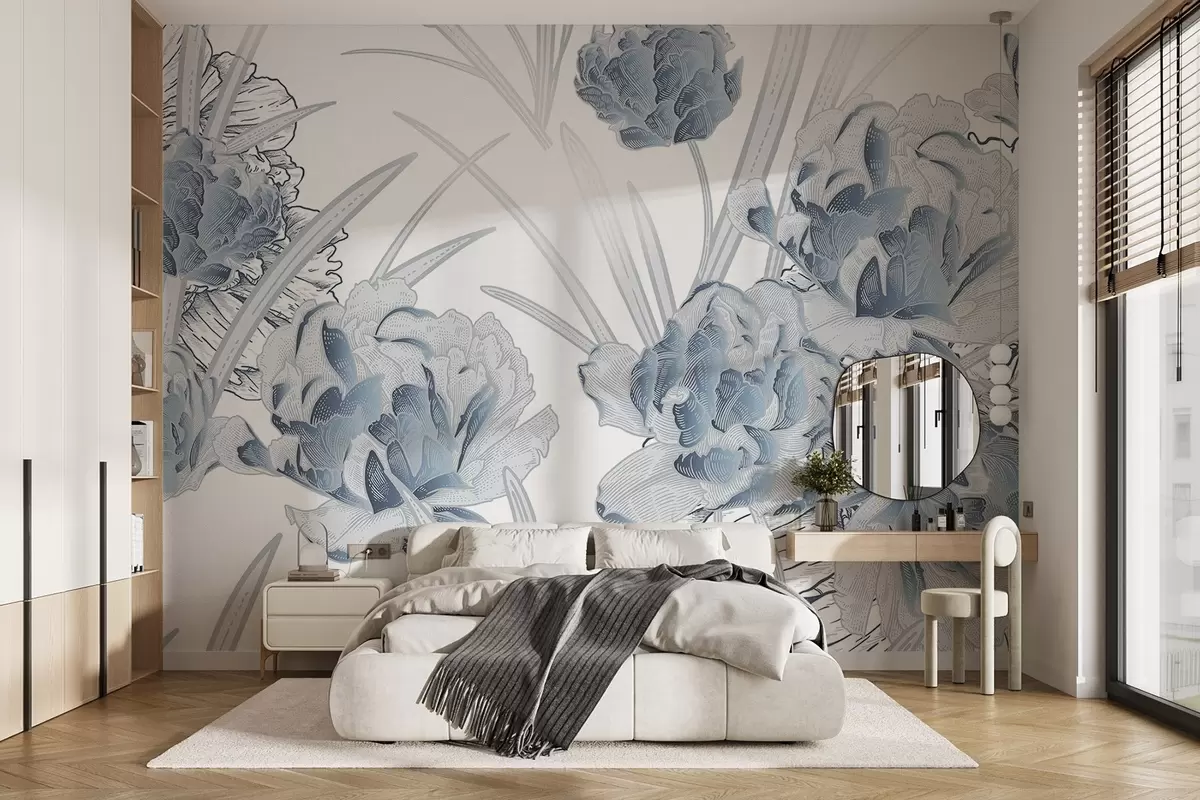 Murais de parede Peónias azuis com folhas sobre um fundo branco, desenho floral, ilustração botânica Nr. w08896