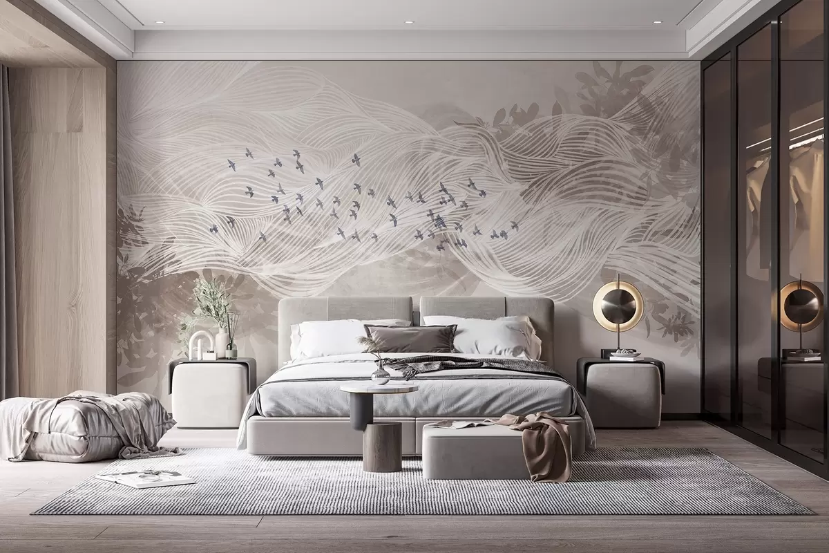 Murais de parede Bando de pássaros a sobrevoar uma paisagem de arte de linhas abstractas com textura de ondas bege, cores suaves, design minimalista Nr. w08898