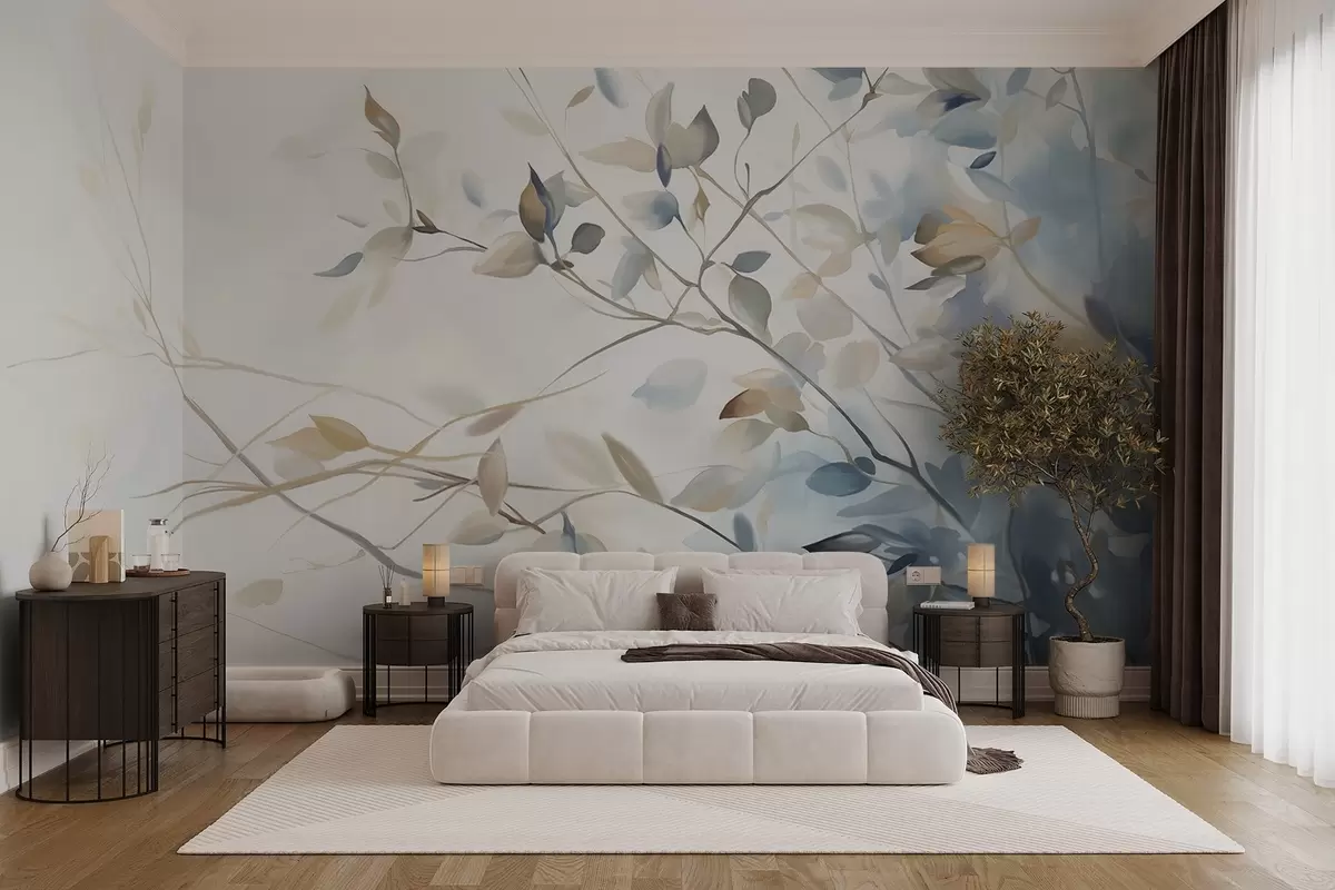 Murais de parede Ramos com folhas em tons de azul e castanho, fundo claro, suave e delicado, estilo aguarela Nr. w08900