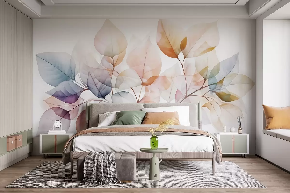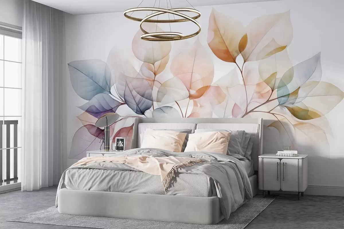 Murais de parede Pintura a aguarela de folhas translúcidas em cores pastel, com tons de rosa, branco, roxo e azul Nr. w08910