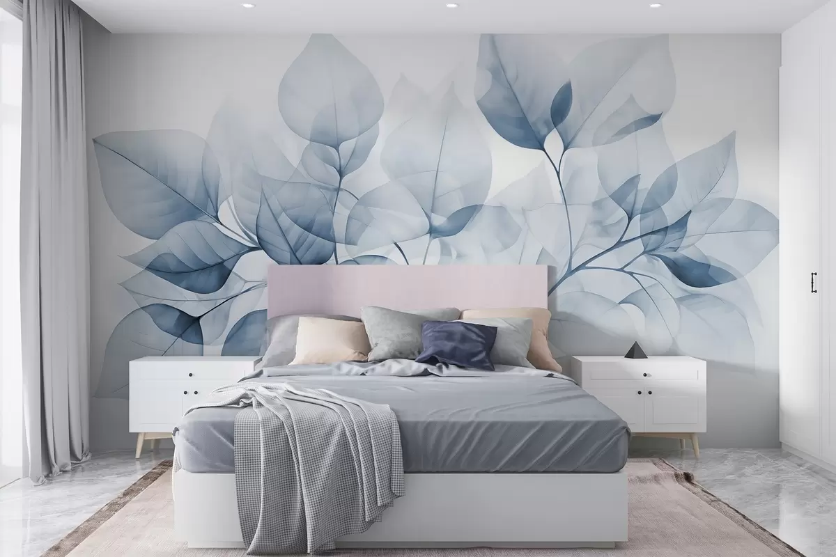 Murais de parede Pintura a aguarela de folhas translúcidas em cores pastel, com tons de branco e azul Nr. w08910v1