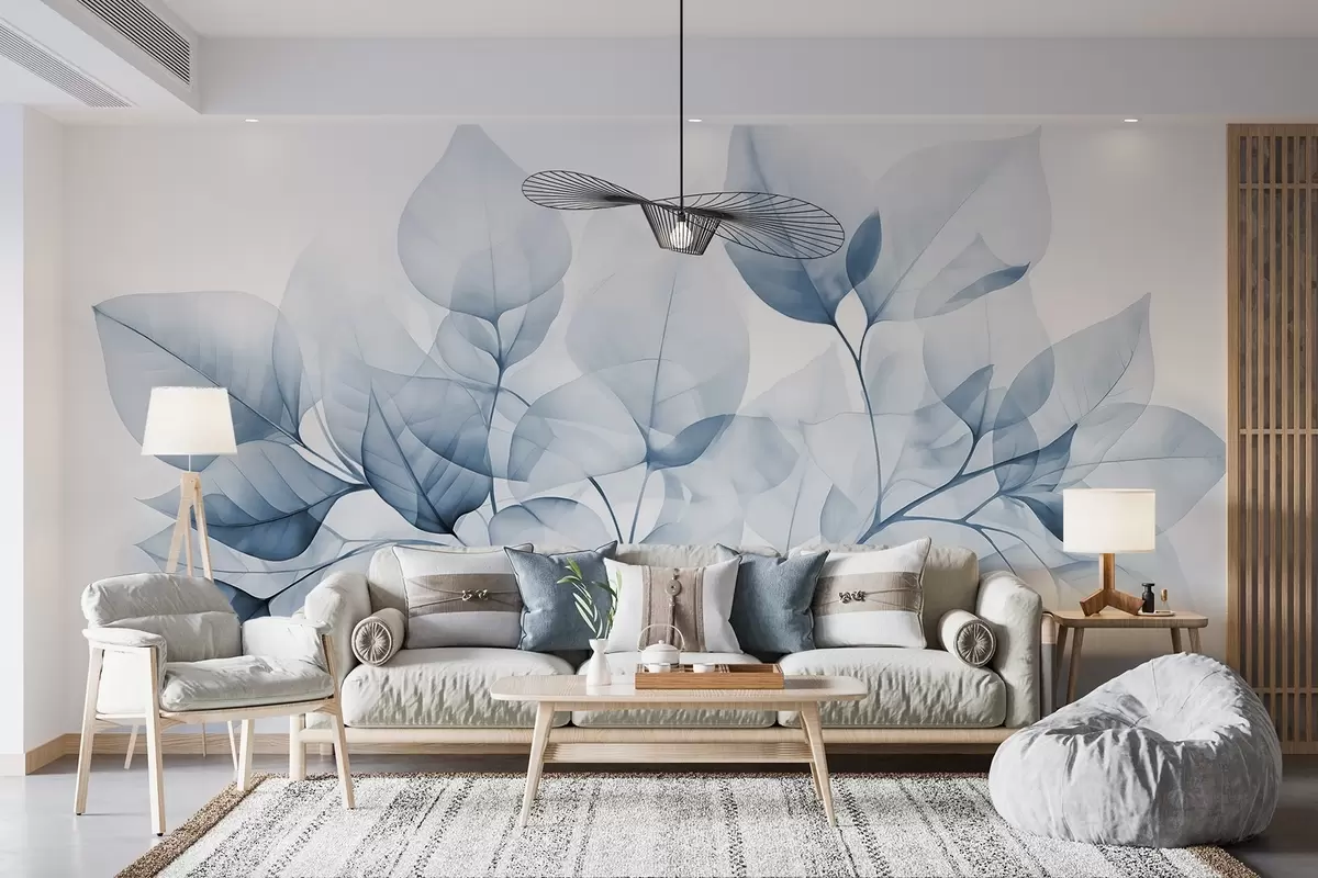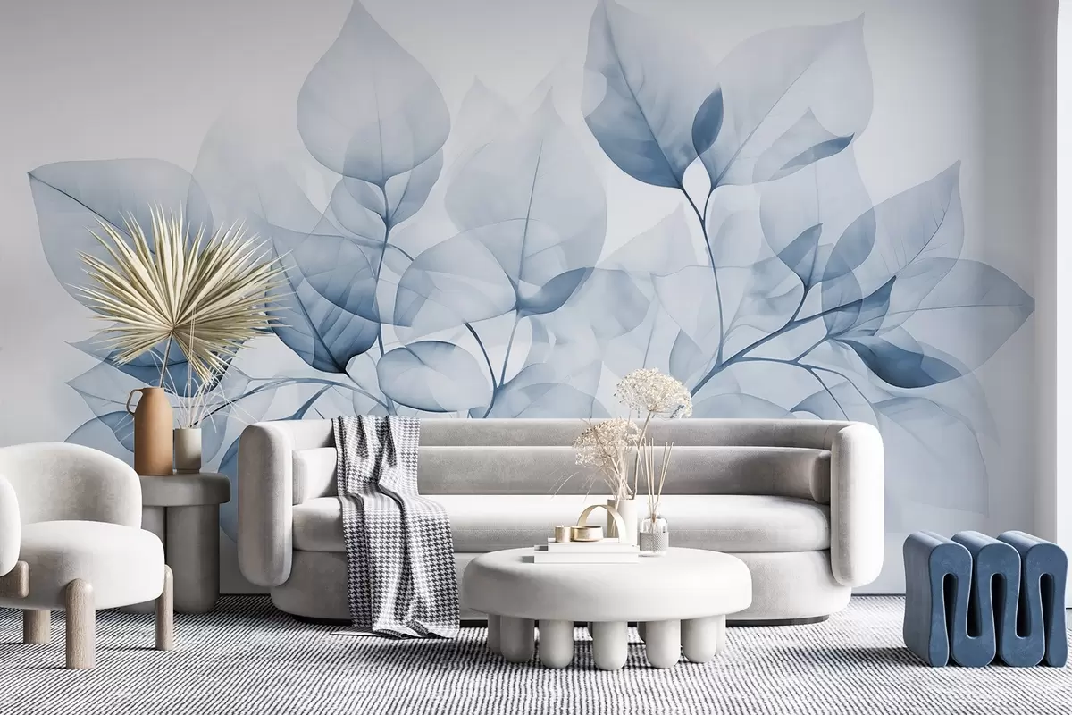 Murais de parede Pintura a aguarela de folhas translúcidas em cores pastel, com tons de branco e azul Nr. w08910v1