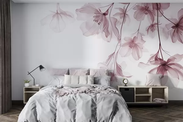 Murais de parede Flores cor-de-rosa com pétalas translúcidas penduradas num ramo, cor-de-rosa e branco, composição de arte moderna minimalista Nr. w08911v2