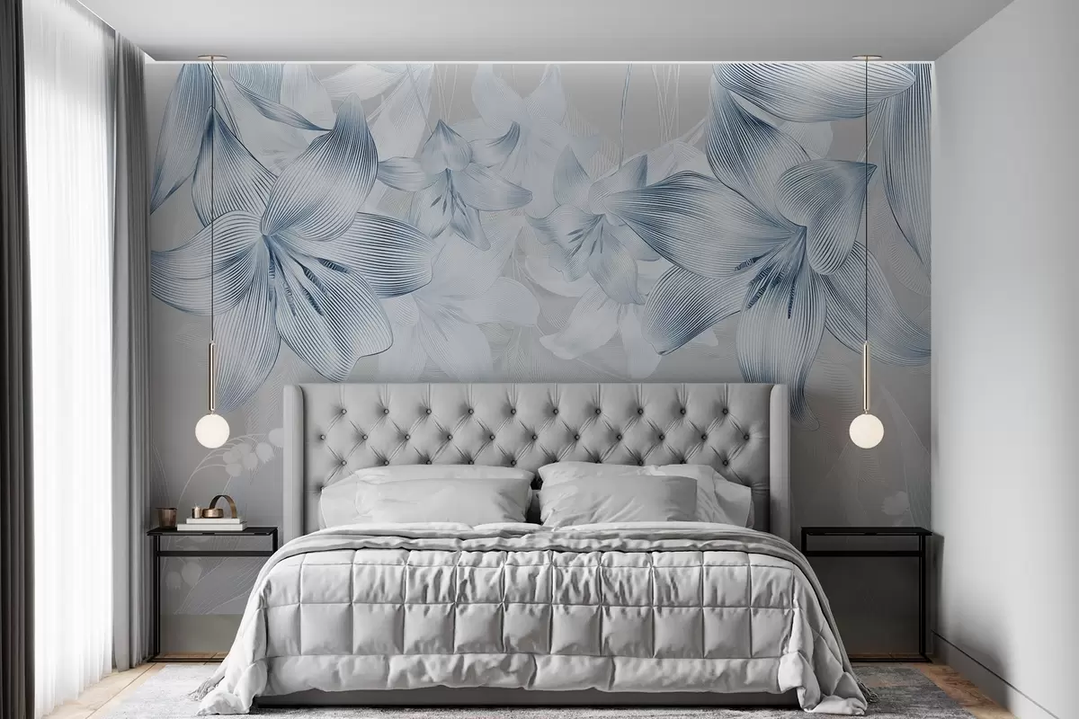 Murais de parede Lírios azuis com pormenores de linhas intrincadas, arranjo floral elegante, paleta de cores neutras Nr. w08912v1