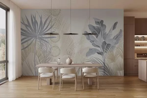 Murais de parede Folhas tropicais em tons de azul e bege, folhas de palmeira, folhas de bananeira e ornamentos de mandala, fundo claro Nr. w08913v2