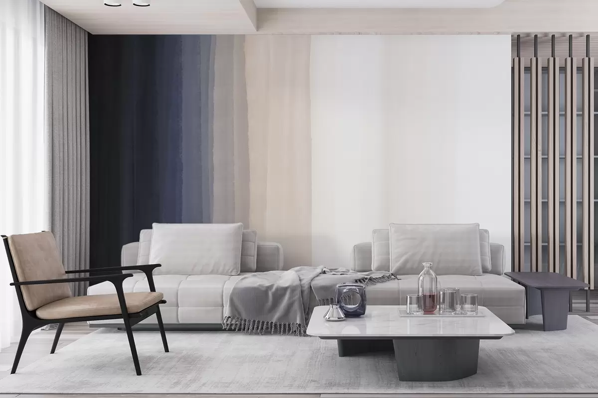 Murais de parede Impressão abstrata minimalista em gradiente com riscas verticais de azul escuro, pêssego claro e branco Nr. w08915v1