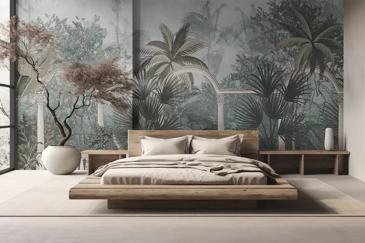 Murais de parede Jardim tropical texturado com palmeiras e vegetação luxuriante, balaustrada com arcos, cores suaves, estilo vintage Nr. w08916