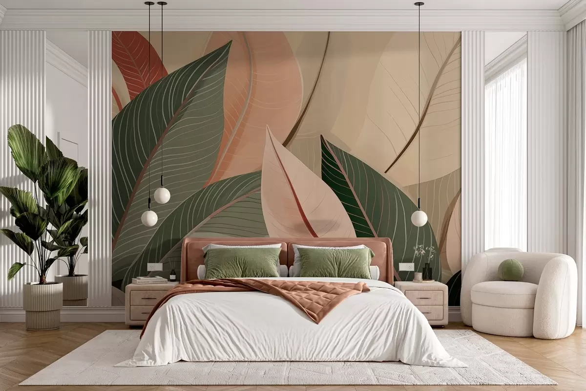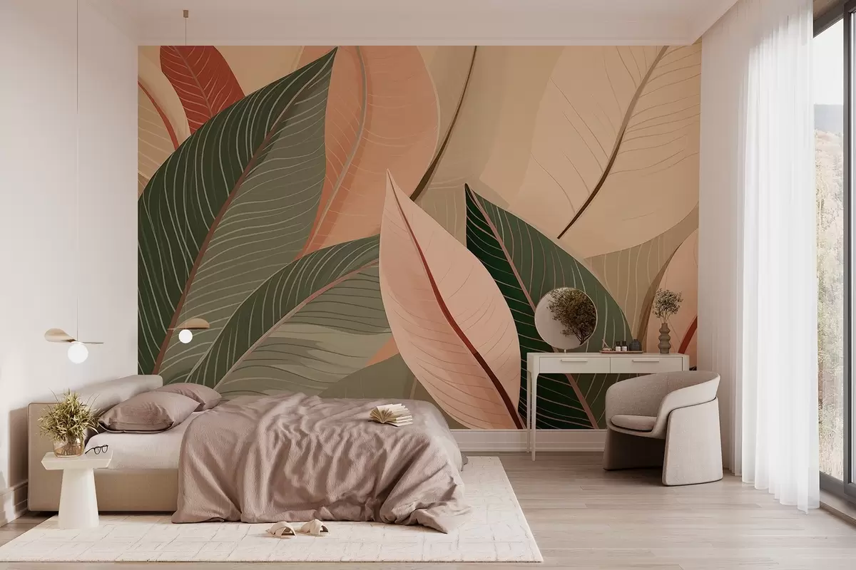 Murais de parede Grande plano de folhas nas cores verde-azeitona e rosa-creme Nr. w08944