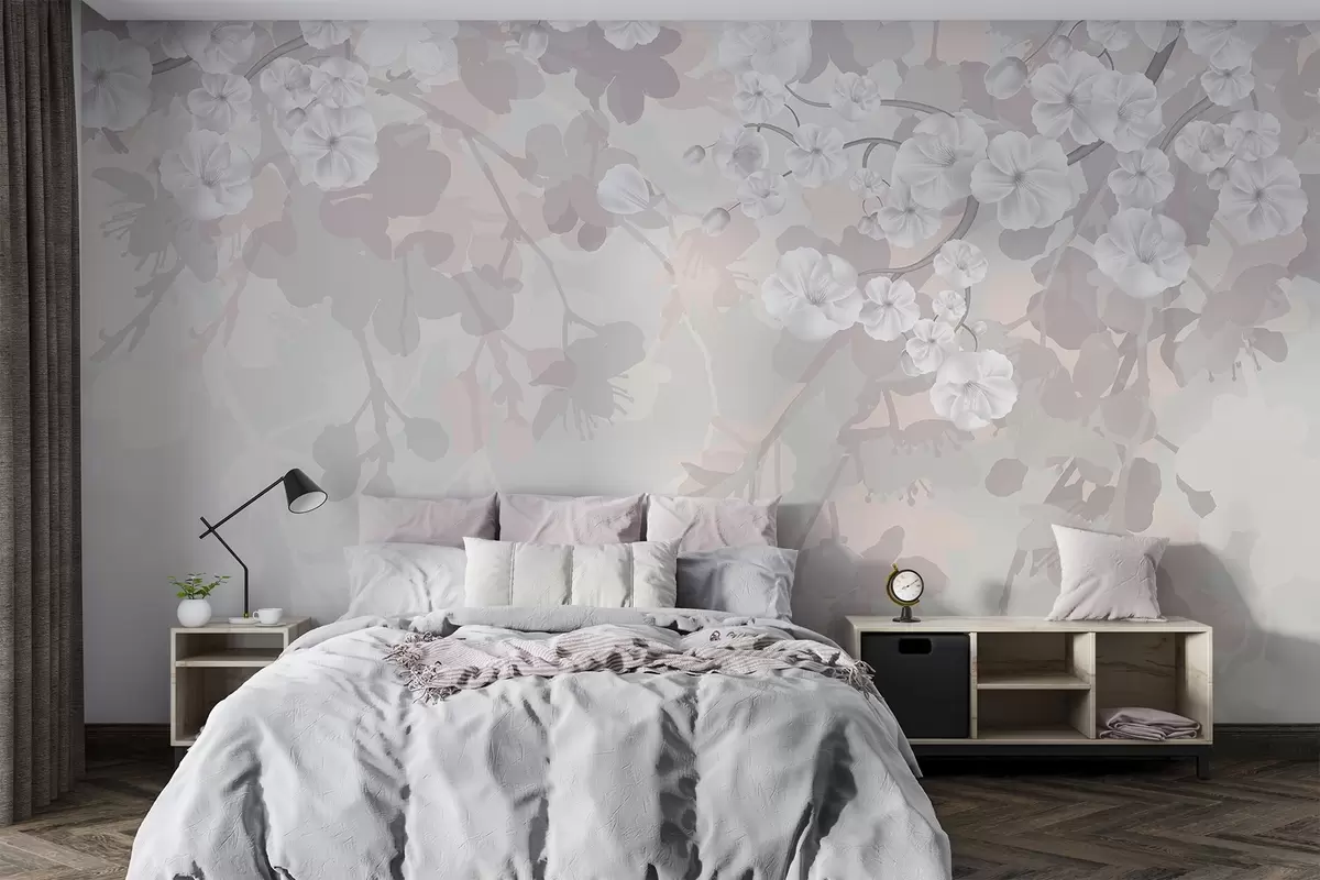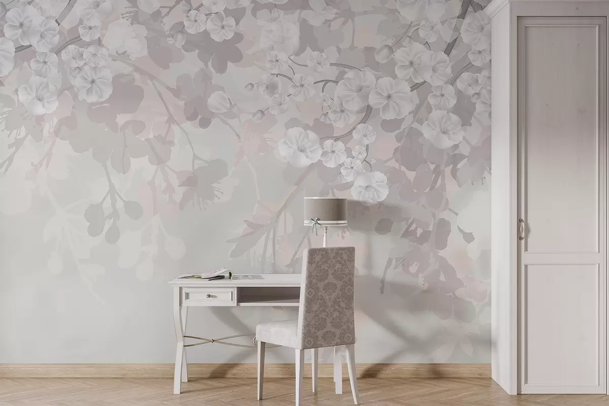 Murais de parede Ramos de cerejeira com flores brancas e folhas cinzentas, sobre elegantes silhuetas florais em tons pastel suaves Nr. w08973v1