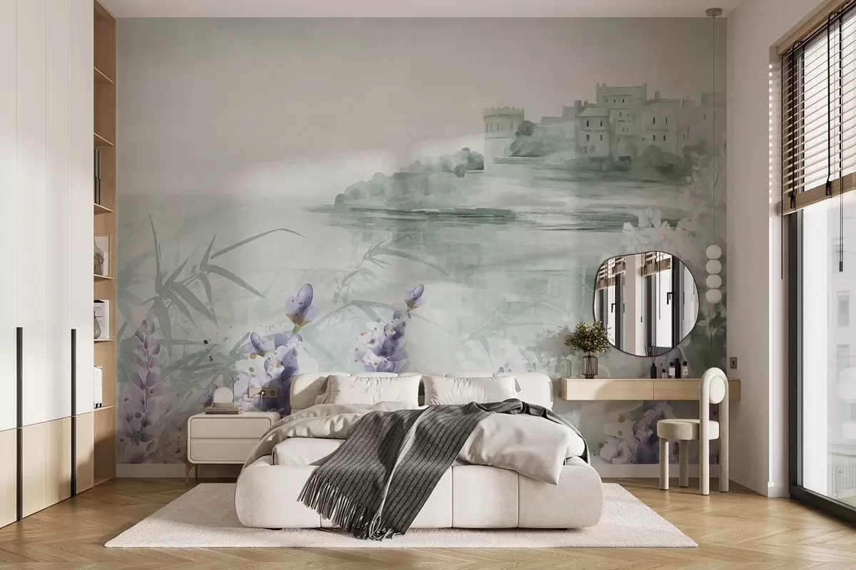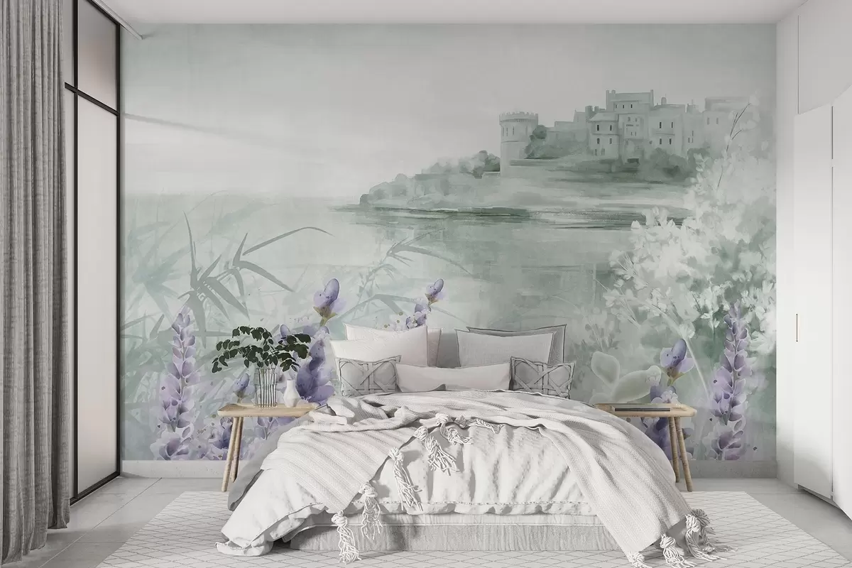 Murais de parede Paisagem vintage texturada com um castelo num penhasco com vista para o mar, com flores de alfazema em cores suaves Nr. w08975