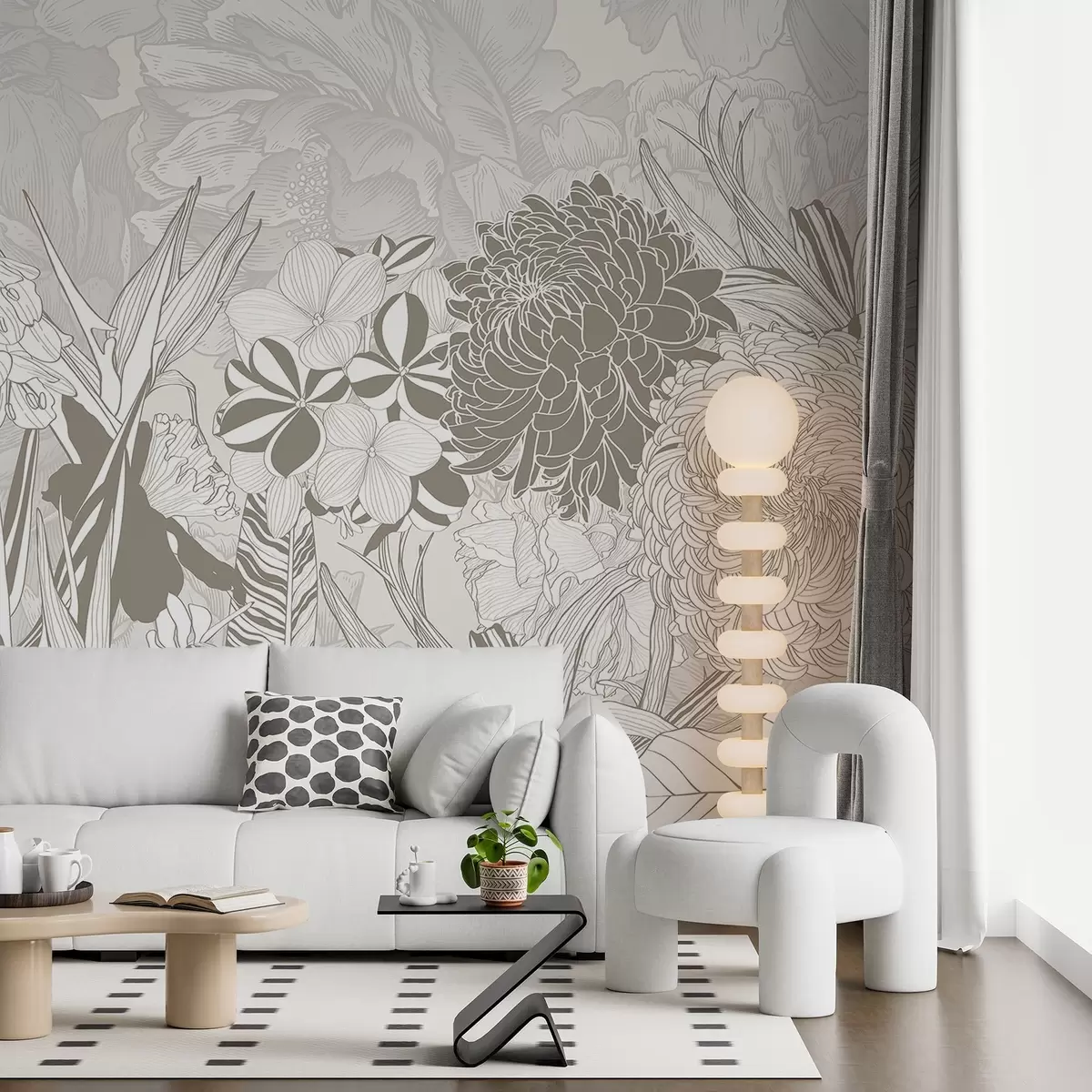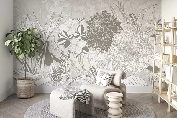 Murais de parede Flores e folhas em tons de bege, incluindo crisântemos, plumeria e folhagem tropical, desenho botânico Nr. w08976