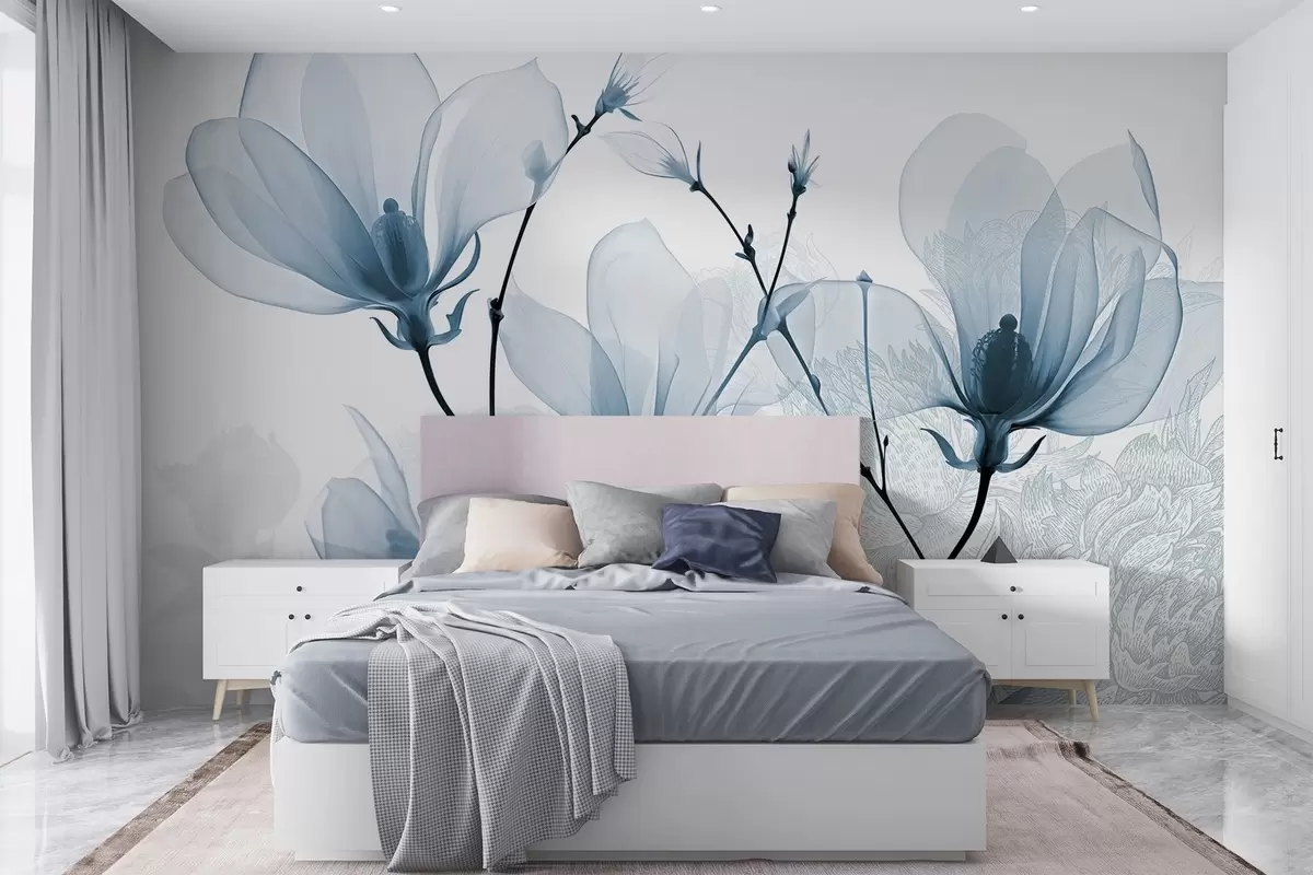 Murais de parede Flores de magnólia azuis translúcidas com silhuetas de flores com pétalas delicadas e caules escuros Nr. w08978