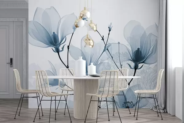 Murais de parede Flores de magnólia azuis translúcidas com silhuetas de flores com pétalas delicadas e caules escuros Nr. w08978
