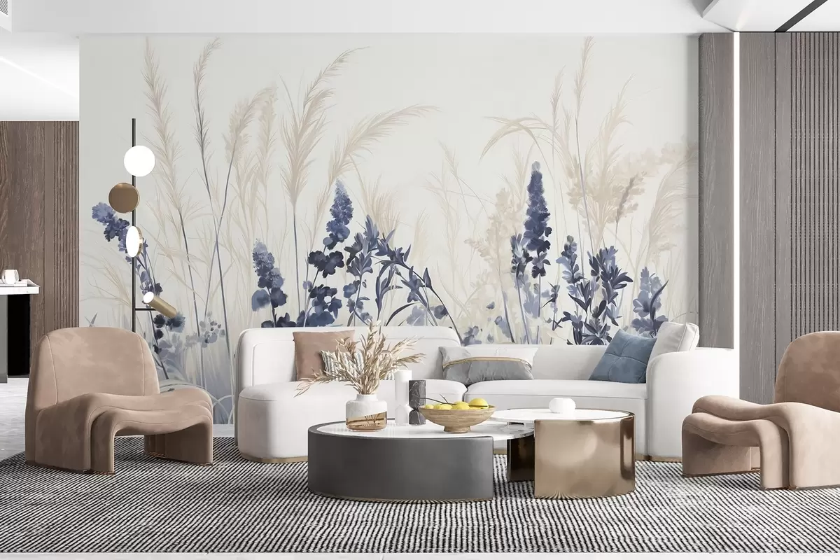 Murais de parede Flores azuis e canas bege num campo, textura de pintura minimalista, fundo claro, cores suaves, pinceladas delicadas Nr. w08982