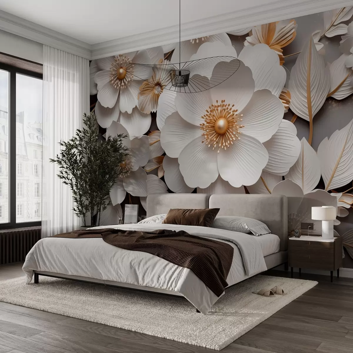 Murais de parede flores 3D em estilo origami em tons de amarelo-cinzento Nr. w08993