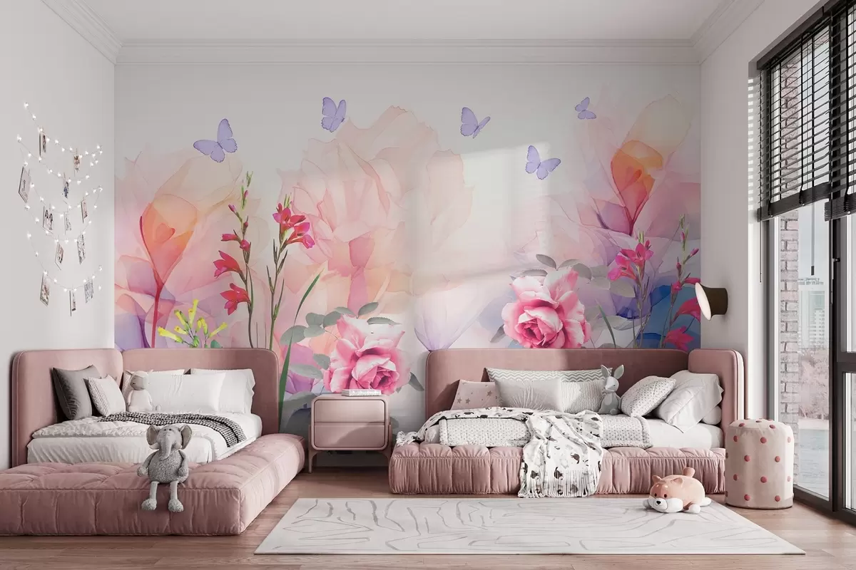 Murais de parede Flores com borboletas e rosas em estilo aguarela Nr. w09002