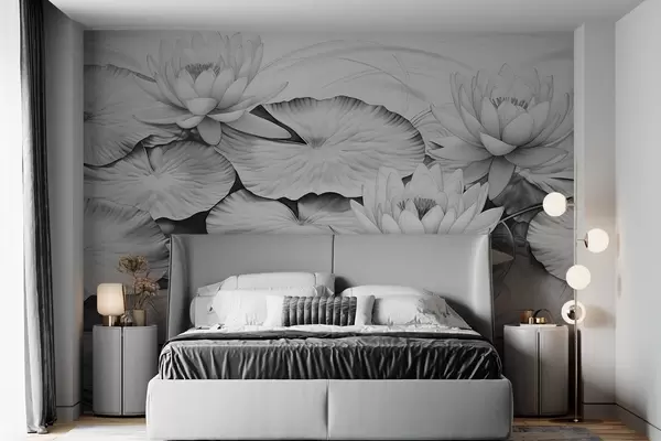 murais de parede Nenúfares e nenúfares num lago, imitação a preto e branco de um desenho a lápis, ilustração botânica pormenorizada, arte da natureza w09006