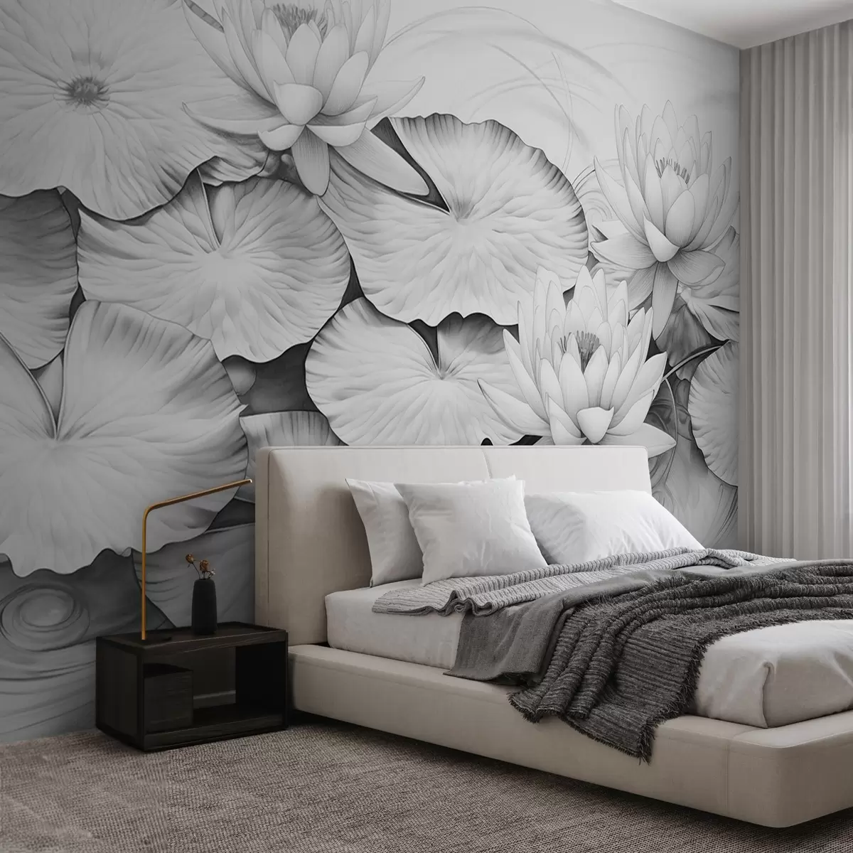 Murais de parede Nenúfares e nenúfares num lago, imitação a preto e branco de um desenho a lápis, ilustração botânica pormenorizada, arte da natureza Nr. w09006