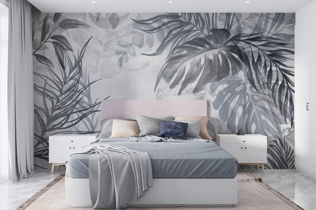 Murais de parede Monstera e folhas de palmeira em tons de azul e cinzento, botânica, folhagem tropical, plantas da selva, fundo texturado Nr. w09011v1