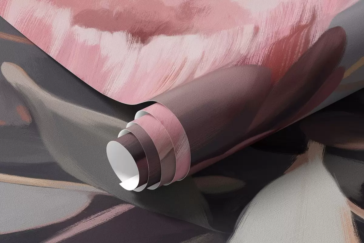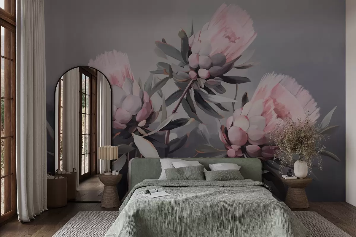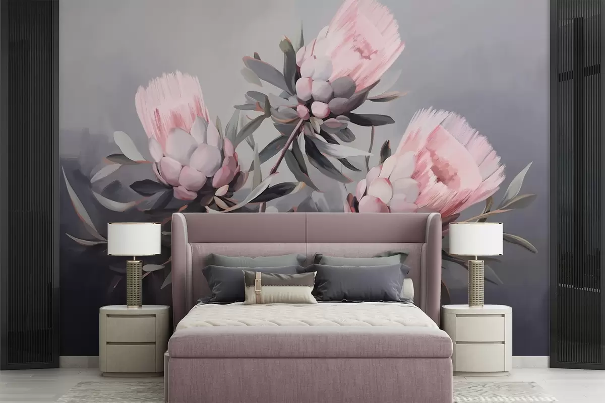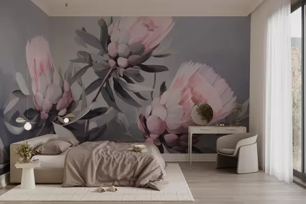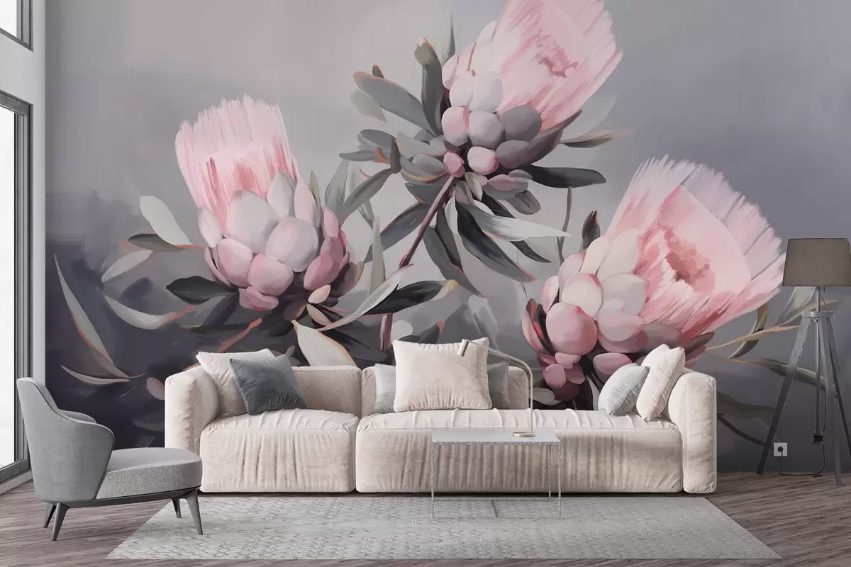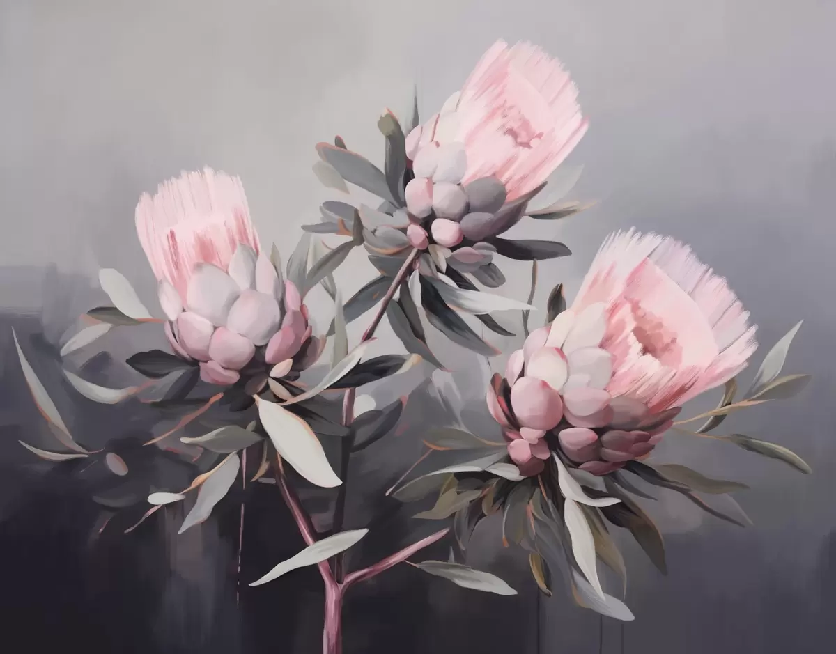 Murais de parede Flores abstractas de protea cor-de-rosa com folhas cinzentas, pinceladas de textura suave, cores suaves, sobre um fundo cinzento esbatido Nr. w09014