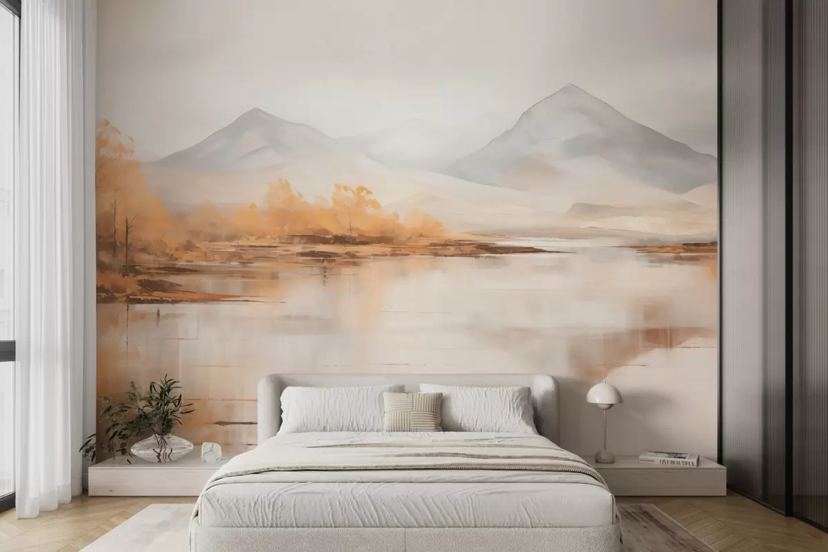Murais de parede Paisagem de outono com árvores amarelas e um rio num cenário de montanha Nr. w09020