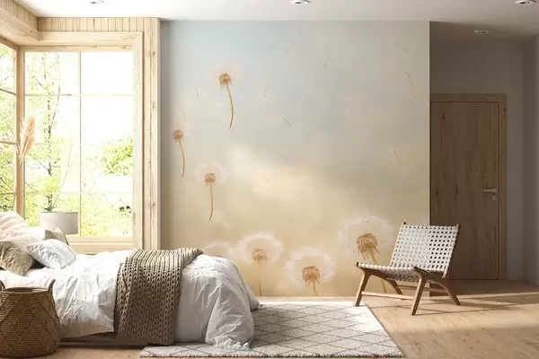 Murais de parede Dentes-de-leão beges e arejados que sopram ao vento contra o céu Nr. w09028