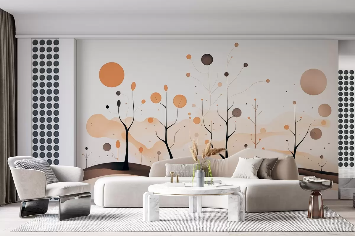 Murais de parede Árvores abstractas com esferas e sol em tons de bege e cinzento Nr. w09043