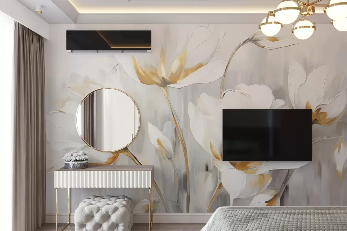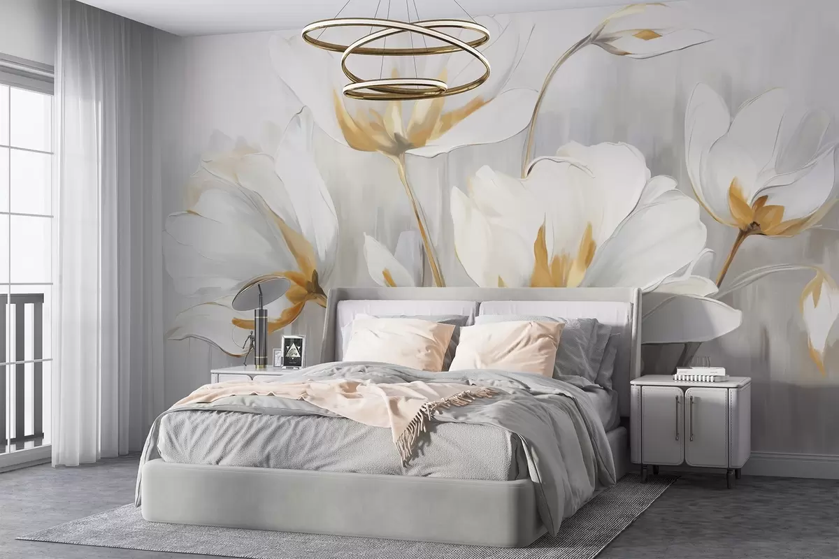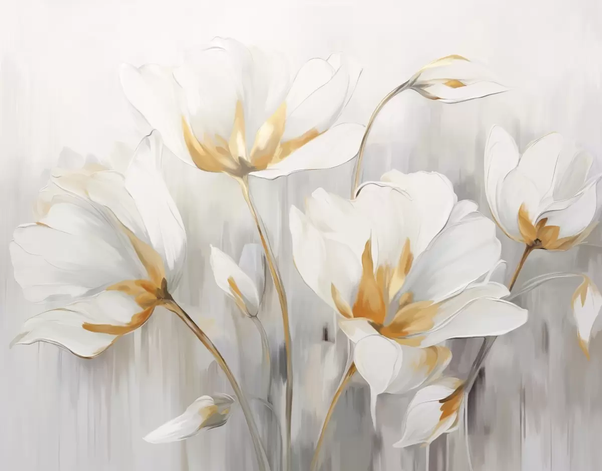 Murais de parede Flores abstractas brancas com pétalas e caules brancos sobre um fundo cinzento com pinceladas verticais cinzentas e brancas Nr. w09047