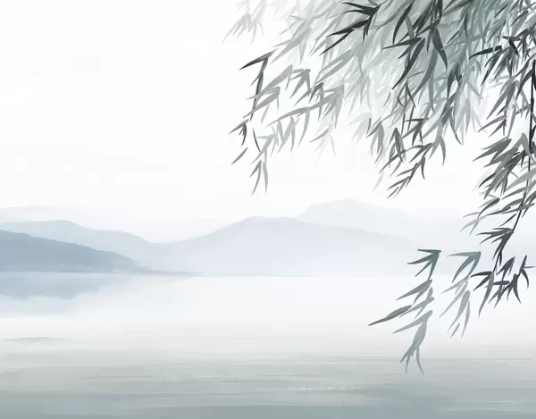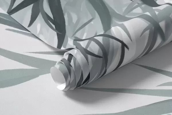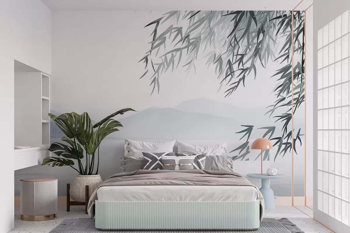 Murais de parede Folhas de bambu penduradas sobre um lago com montanhas em fundo, tons suaves de azul e branco, estilo de pintura a tinta Nr. w09048