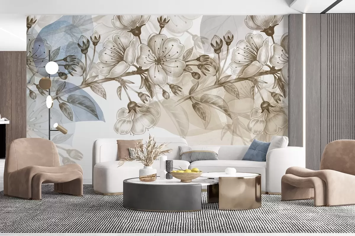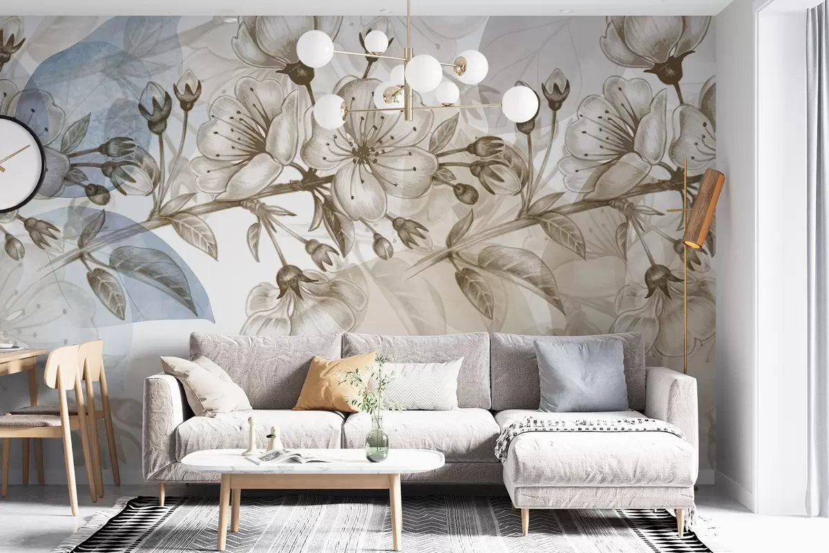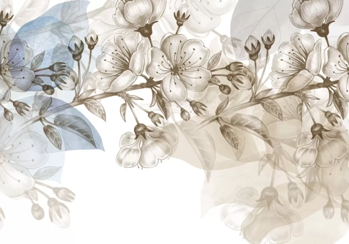 Murais de parede Ramo de cerejeira com flores e botões, tons sépia, fundo suave tipo aguarela com tons azuis e castanhos Nr. w09051