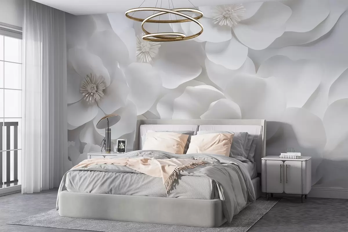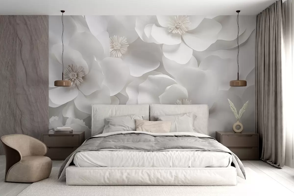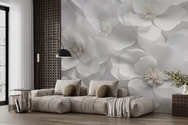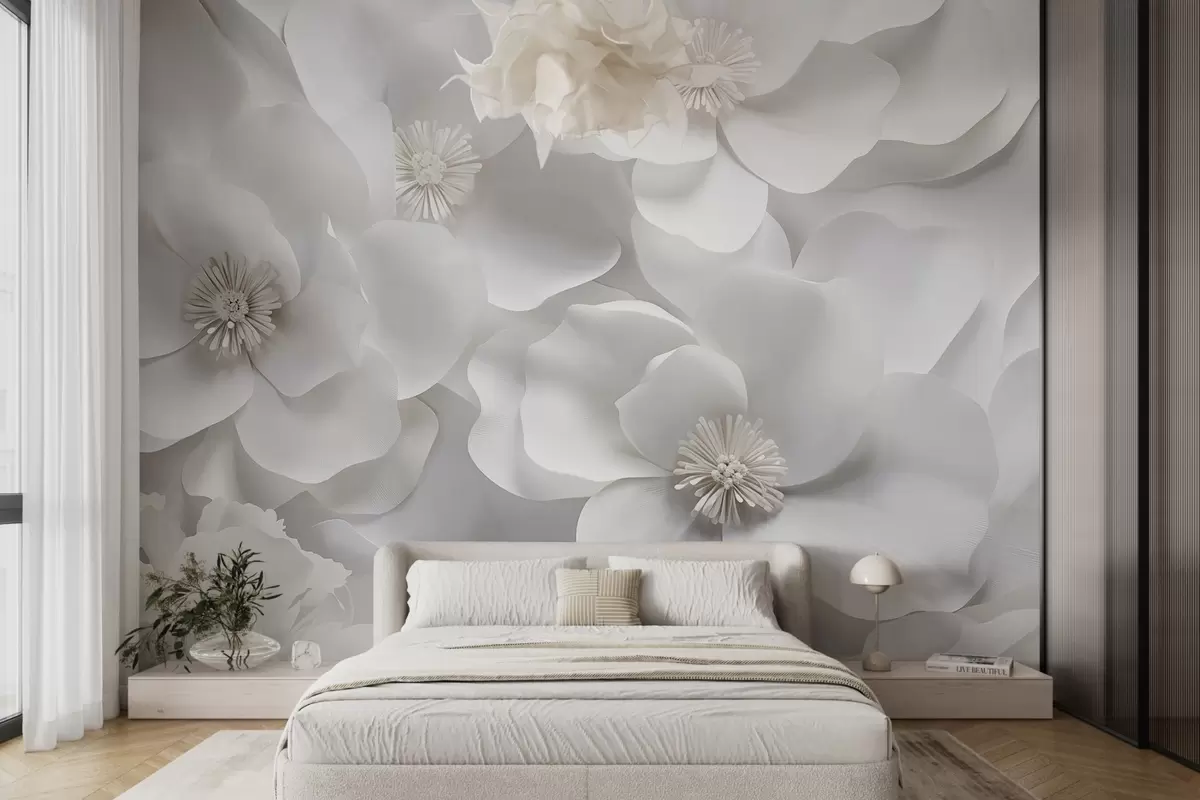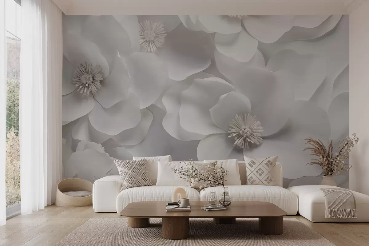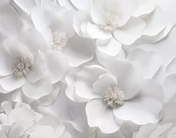 Murais de parede Flores brancas com pétalas delicadas, dispostas num cacho denso, criando uma sensação de pureza e elegância sobre um fundo branco Nr. w09053