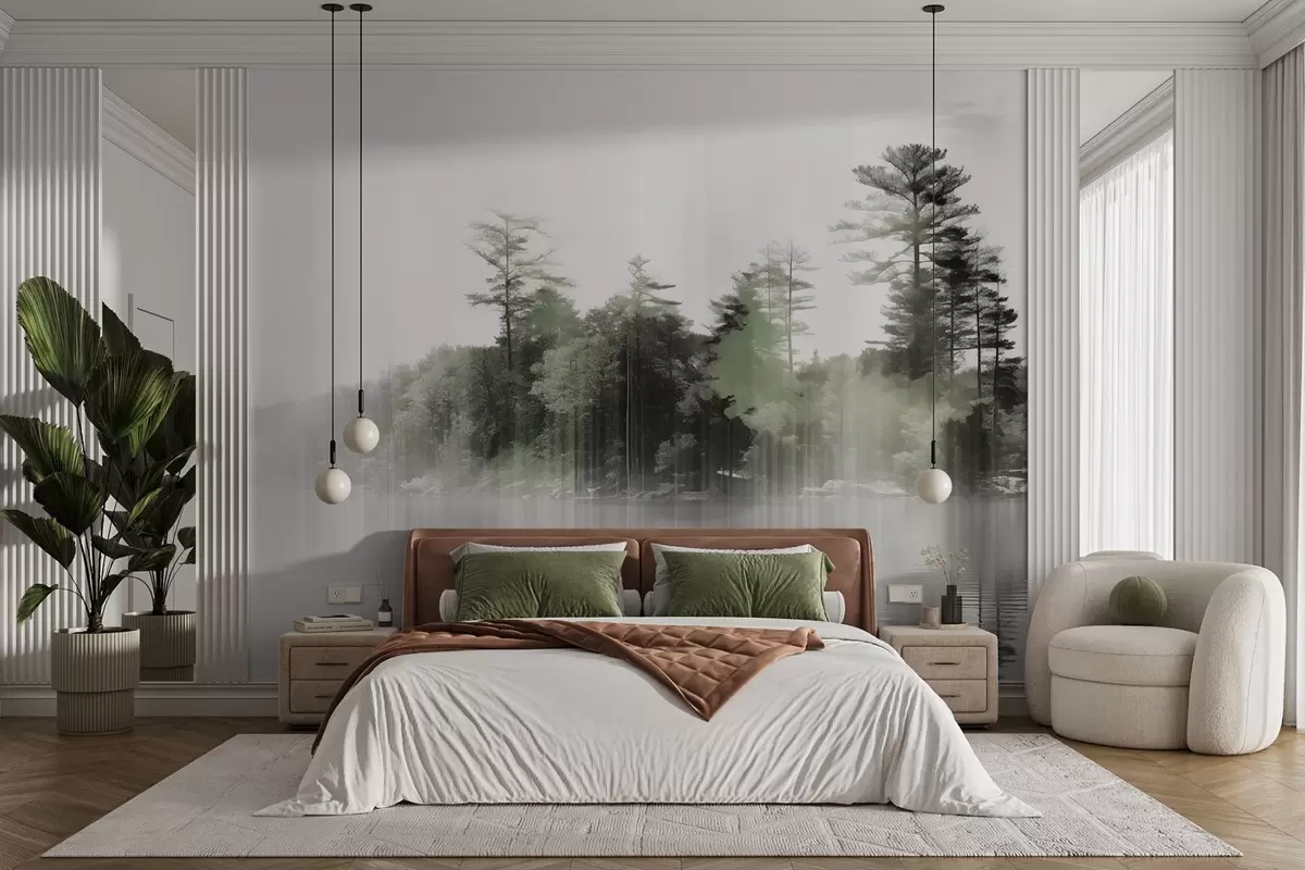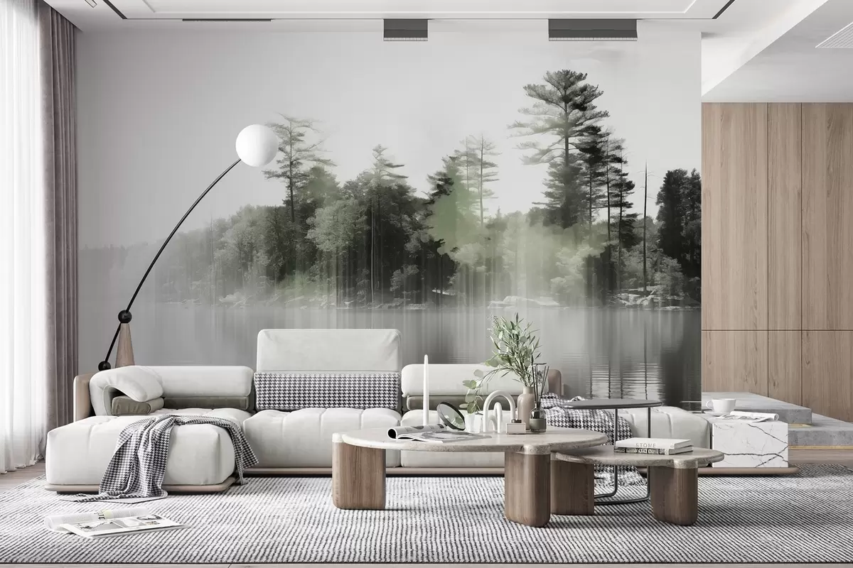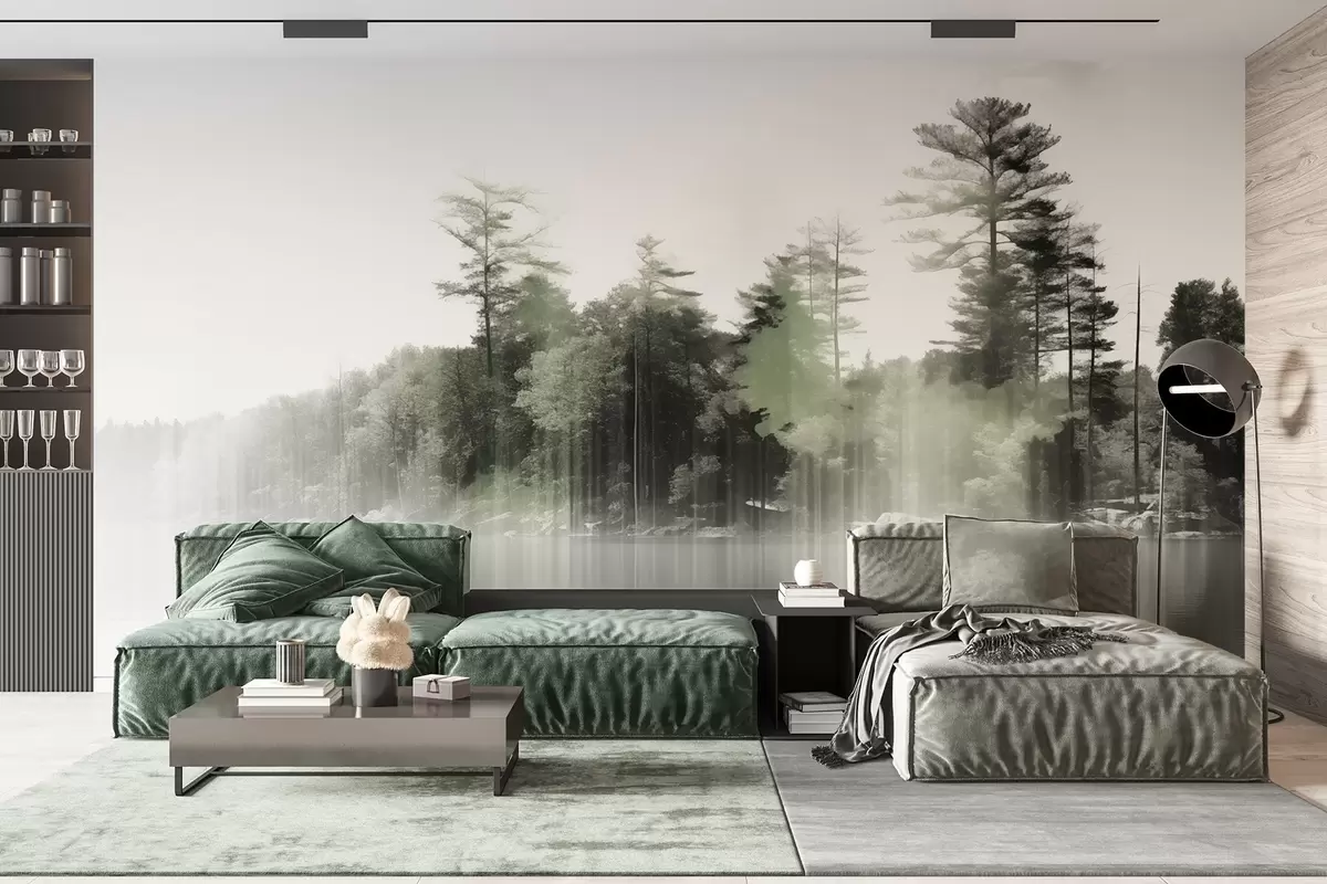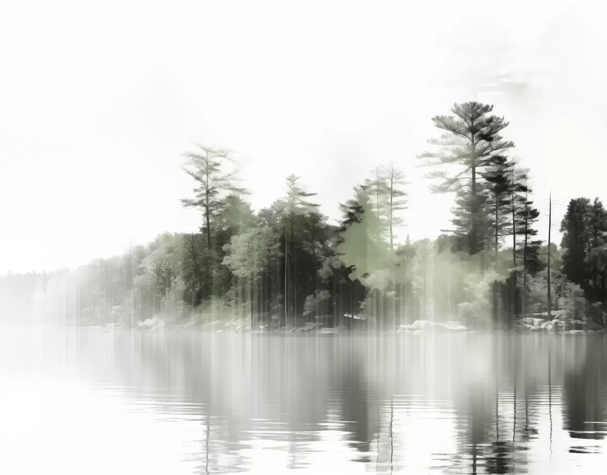 Murais de parede Paisagem abstrata minimalista texturada com um lago e reflexos de árvores na água em tons de verde e branco Nr. w09058