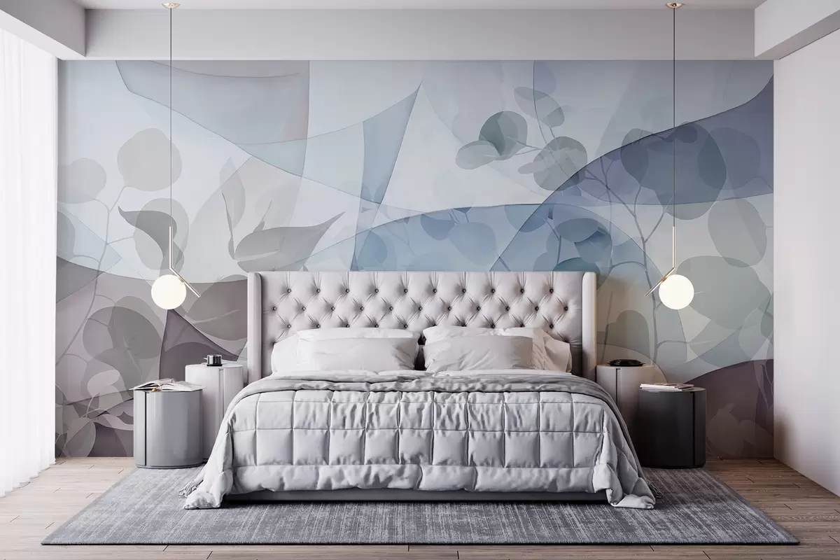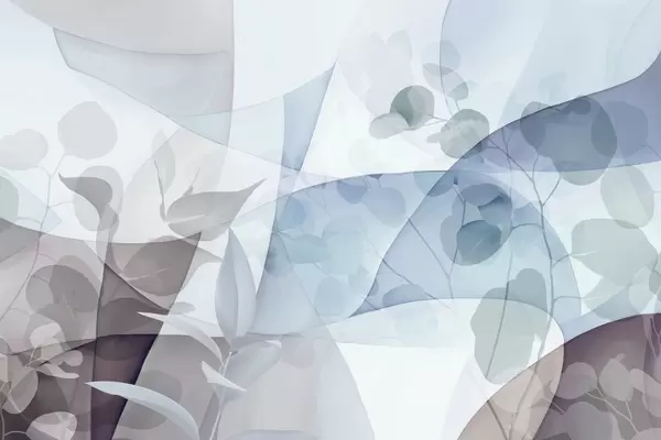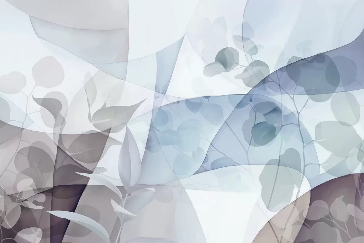 Murais de parede Ilustração botânica abstrata com folhas de eucalipto e formas geométricas em tons suaves de azul, castanho e branco Nr. w09061