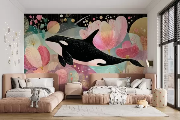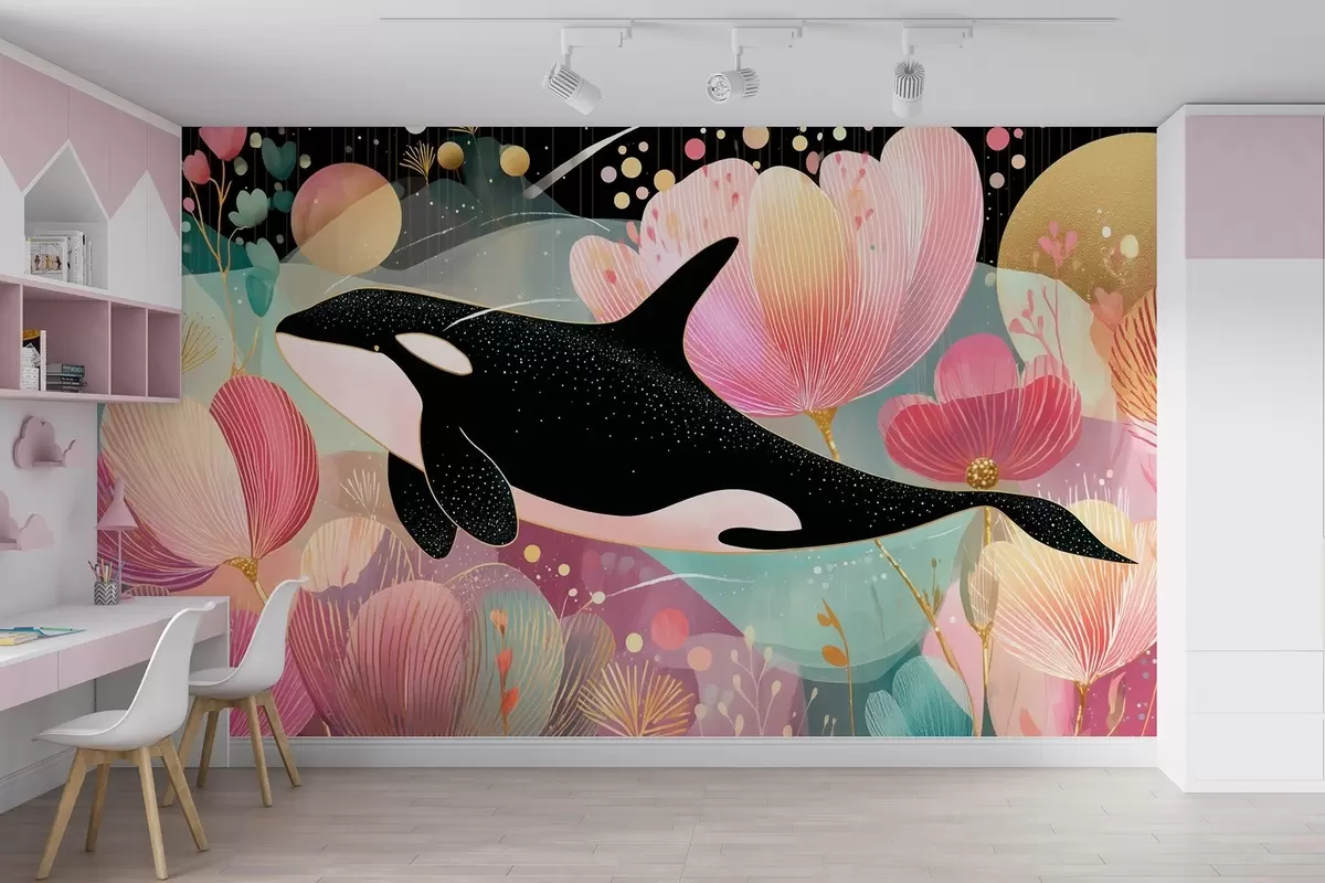 Murais de parede Uma orca preta a nadar sobre um fundo de flores cor-de-rosa Nr. w09074